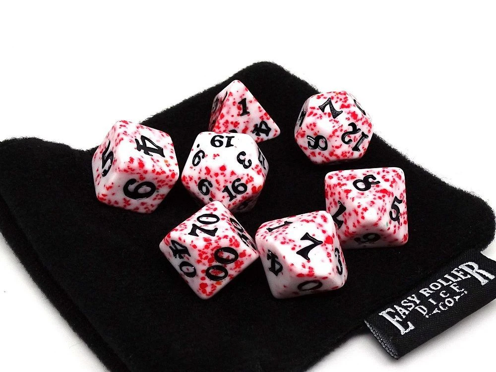 Each dice set includes a small dice bag from Easy Roller Dice Company at no additional charge. These dice bags can hole about 21 dice, and include a drawstring closure.