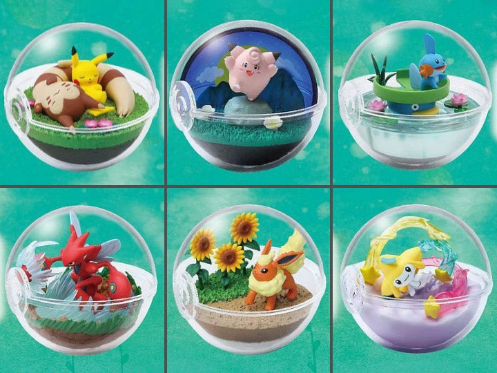 A mystery blind box collectable figure featuring cute Pokémon in a terrarium style Pokéball! This particular Re-ment series is part of the Pokémon Terrarium Collection 8. There are six figures for you to collect: