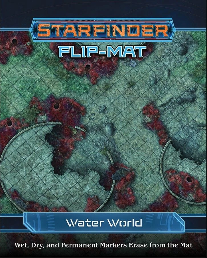 Whether the heroes are exploring an ocean moon or visiting a world flooded after an environmental crisis, no Game Master wants to spend time drawing every coral reef and undersea trench. Fortunately, with Paizo`s latest Starfinder Flip-Mat, you don`t have to! This line of gaming maps provides ready-to-use science-fantasy set pieces for the busy Game Master. This double-sided map features the surface of a wide expanse of water featuring outcroppings of rock and coral on one side and a stretch of seabed on the other. Don`t waste time sketching when you could be playing. With Starfinder Flip-Mat: Water World, you`ll be ready the next time your players discover they need a bigger boat!
